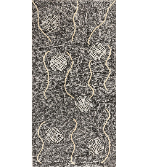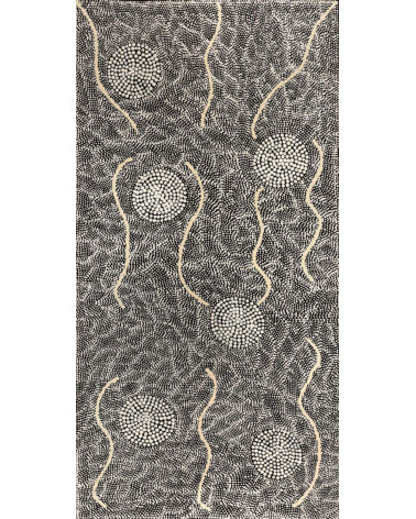 Le lieu représenté sur cette toile, Puyurru, se situe à l’ouest de Yuendumu, dans les Territoires du Nord.